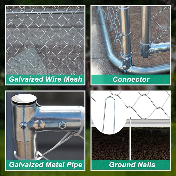 - 【Heavy Duty & Weather-Resistant Construction】This outdoor dog kennel features a galvanized metal frame that helps resist rust and corrosion, making it suitable for long-term outdoor use. The reinforced design, combined with secure cable ties and ground nails, enhances the stability of the dog crate—even for active large dogs. A solid option for outdoor protection in various weather conditions