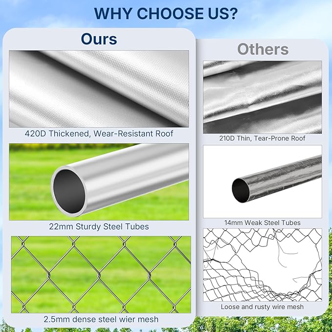 - Thickened Roof Design: This Yafylly 10x10 ft outdoor dog kennel features a thickened 420D Oxford cloth roof, which is more durable than standard kennel roofs. It is water-resistant and UV-resistant, effectively protecting your pet from harsh weather conditions and providing a safe living environment.