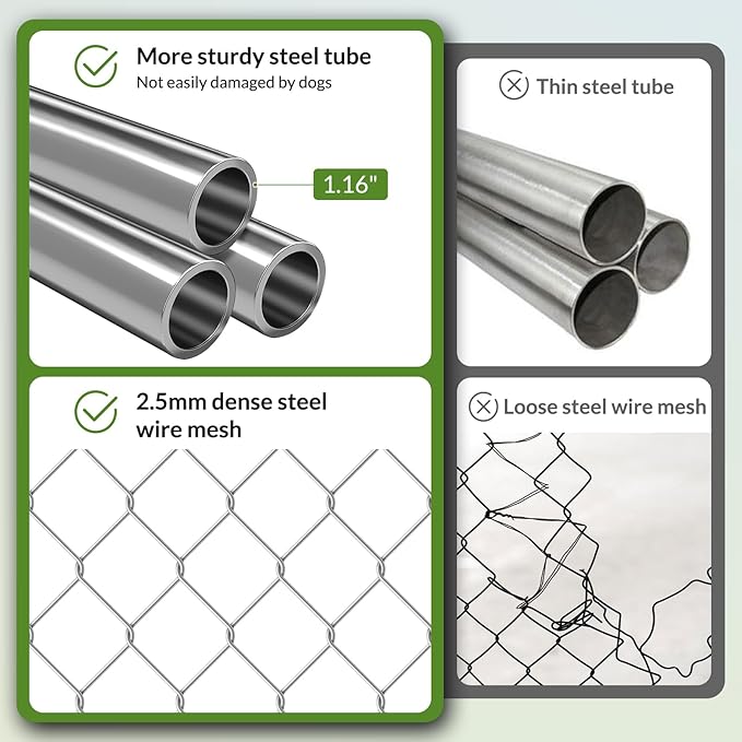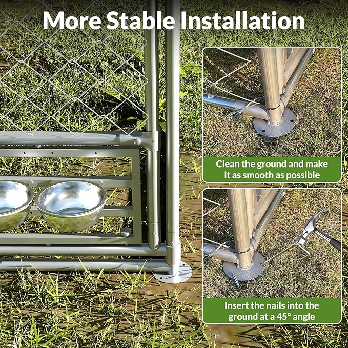 - Upgraded Durability and Stability: Crafted with 1.16" galvanized metal pipes and reinforced 2.5mm thickened steel mesh, Rovibek dog kennel outside is built to withstand rust, bending, and rough outdoor conditions. Ground stakes can be anchored through the base holes to secure the kennel firmly, enhancing overall stability.