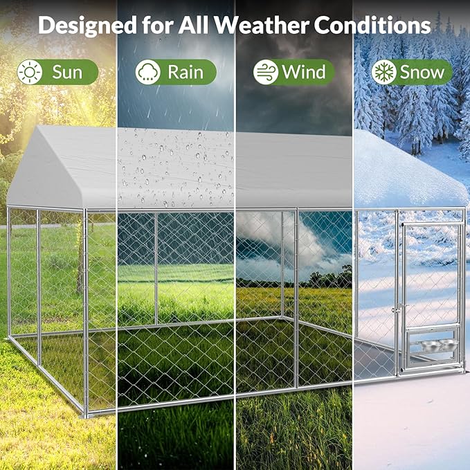Rovibek 10x10 Ft Outdoor Dog Kennel, Outside Dog Kennel with Roof, Dog Kennels Outdoor with 2 Steel Dog Bowls, Outside Kennel for Large Dogs